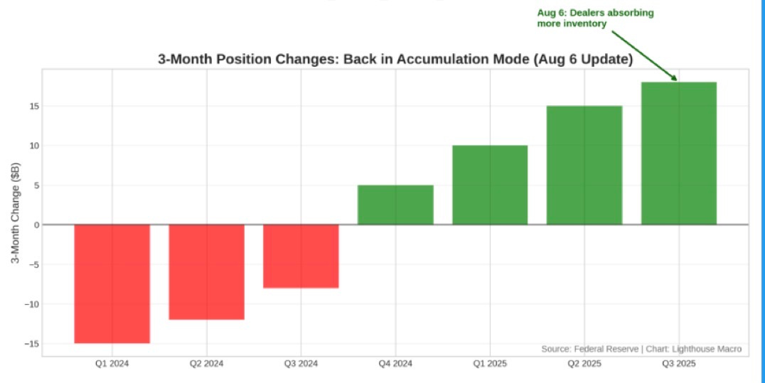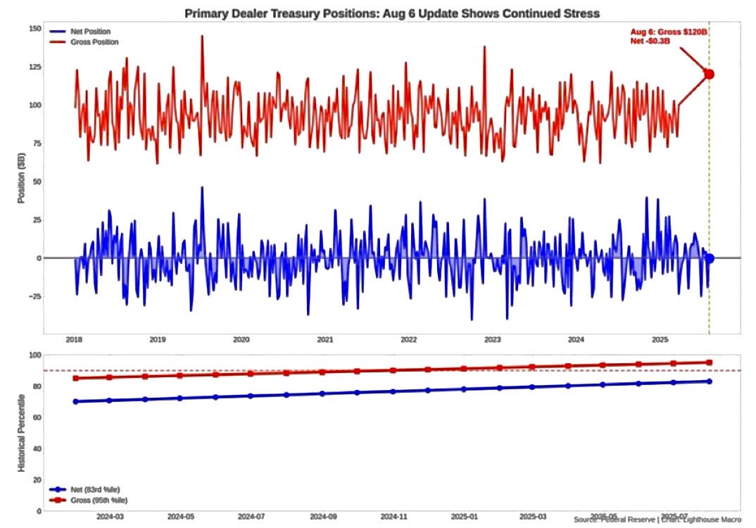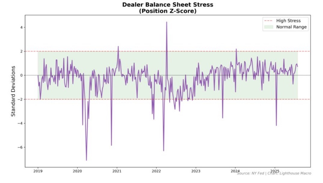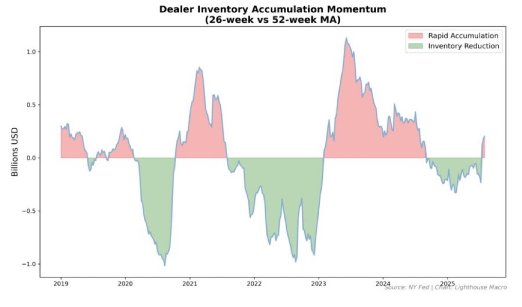 Primary dealer inventory has surged to $120 billion, placing it at the 96th percentile historically. With Supplementary Leverage Ratio (SLR) constraints binding, dealers are operating at 96% of their regulatory ceiling. Our dealer accumulation momentum indicator shows sustained, rapid accumulation throughout 2024-25, with short-term accumulation consistently exceeding long-term trends—a classic sign that dealers are absorbing inventory faster than they can distribute it.