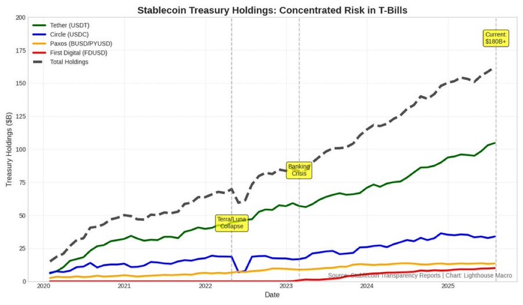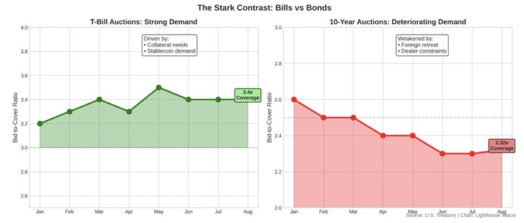 The contrast between the short and long ends of the curve reveals the technical versus fundamental nature of current demand. T-bill auctions remain well-bid with 3.4x coverage ratios, driven by collateral needs and the rise of stablecoin issuers who now hold over $180 billion in T-bills (with Tether alone accounting for $125 billion).
