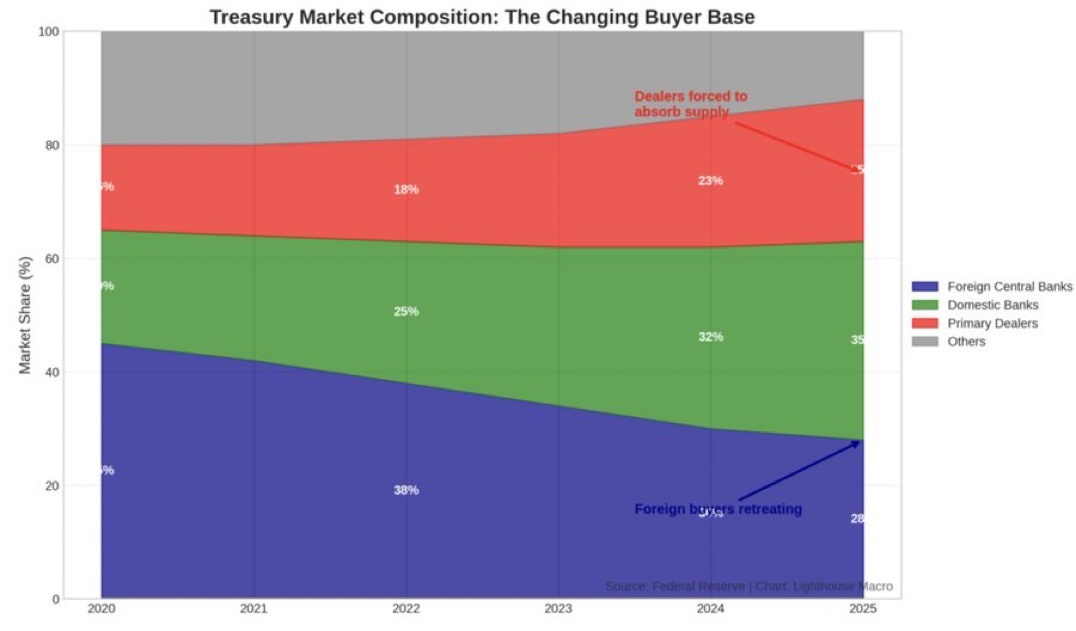 The composition of Treasury buyers has undergone a dramatic transformation. Foreign central banks, once the reliable backbone of demand, have seen their market share decline from 45% in 2020 to just 28% today. This retreat has forced domestic banks and primary dealers to fill the gap, with banks increasing their holdings from 20% to 35% and dealers rising from 15% to 25%.
