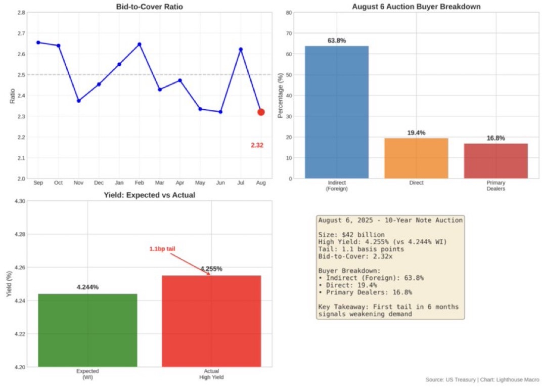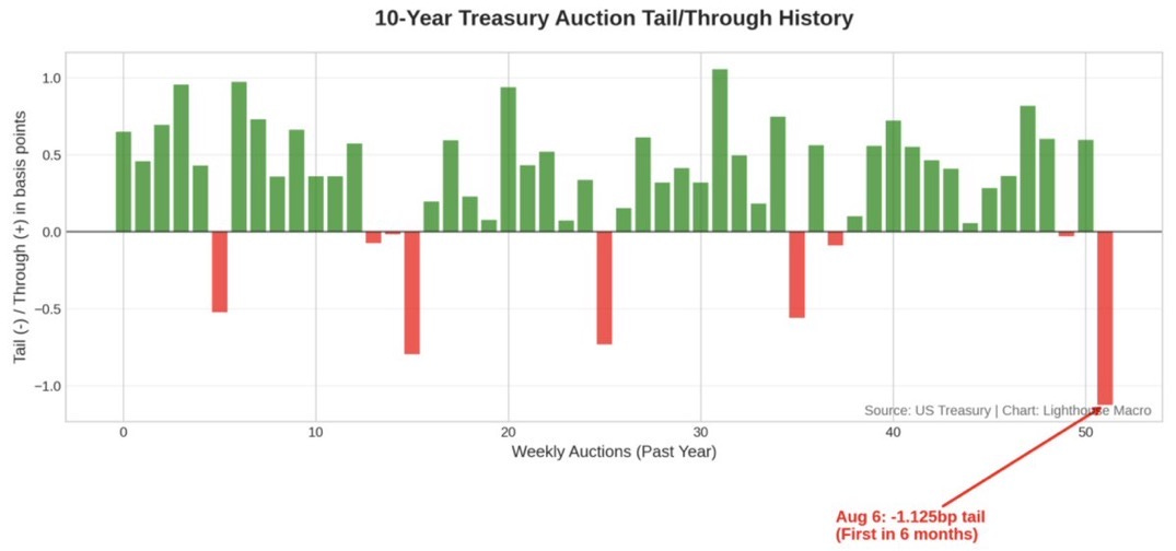 The real risk is that weak auctions become routine and markets stop treating Treasuries as the world's safest asset. Once that perception shifts, there's no easy way back. The August 6 1.125bp tail may be remembered as the canary in the coal mine—the first clear signal that the perpetual bid for U.S. debt is breaking down.