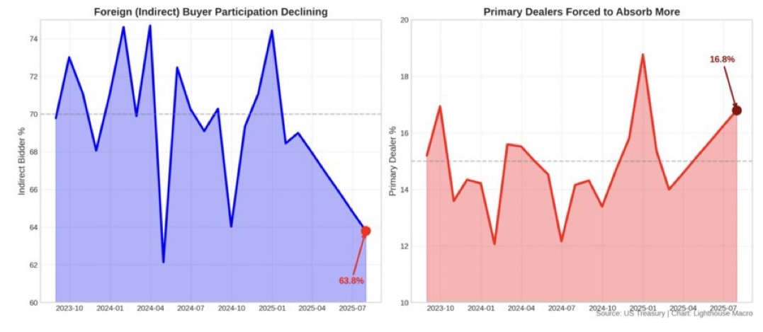 These aren't natural buyers—they're intermediaries being forced to warehouse risk they don't want. The August 6 auction results tell the story: bid-to-cover ratios at 2.32x, foreign demand at 63.8% (down from historical averages near 70%), and dealers forced to absorb 16.8% of the issuance.