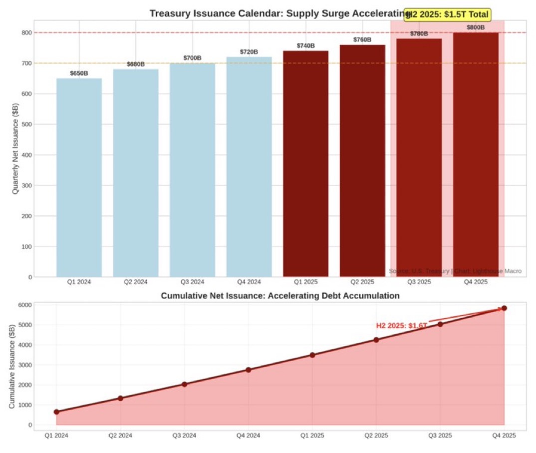 The Treasury's issuance calendar compounds these problems. Net issuance will reach $1.5 trillion in H2 2025, with quarterly totals rising from $700 billion to $800 billion. This supply surge comes precisely when traditional buyers are retreating and intermediaries are constrained.