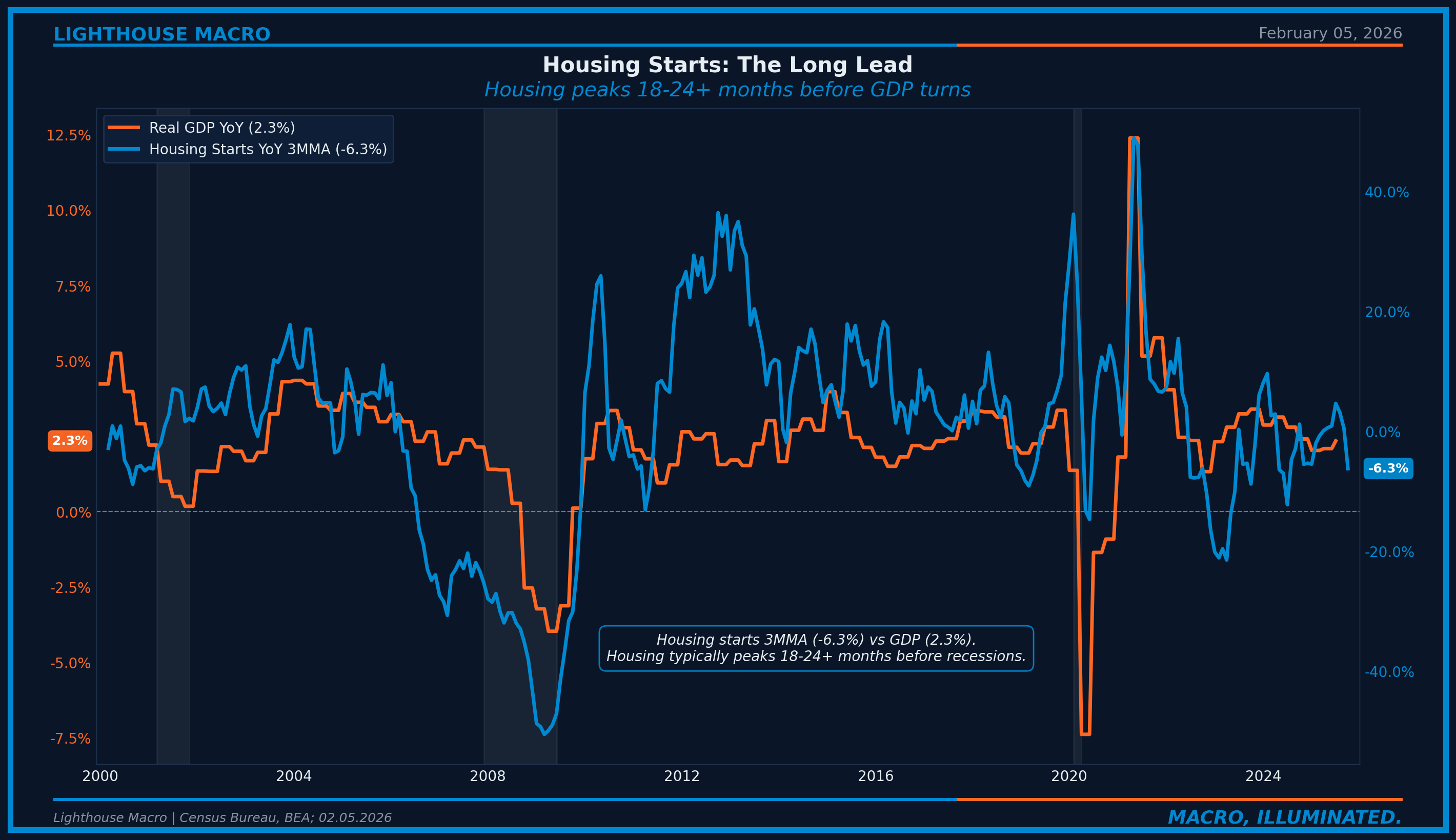 Figure 6: Housing Starts YoY vs Real GDP YoY. Housing typically peaks 18-24+ months before recession.