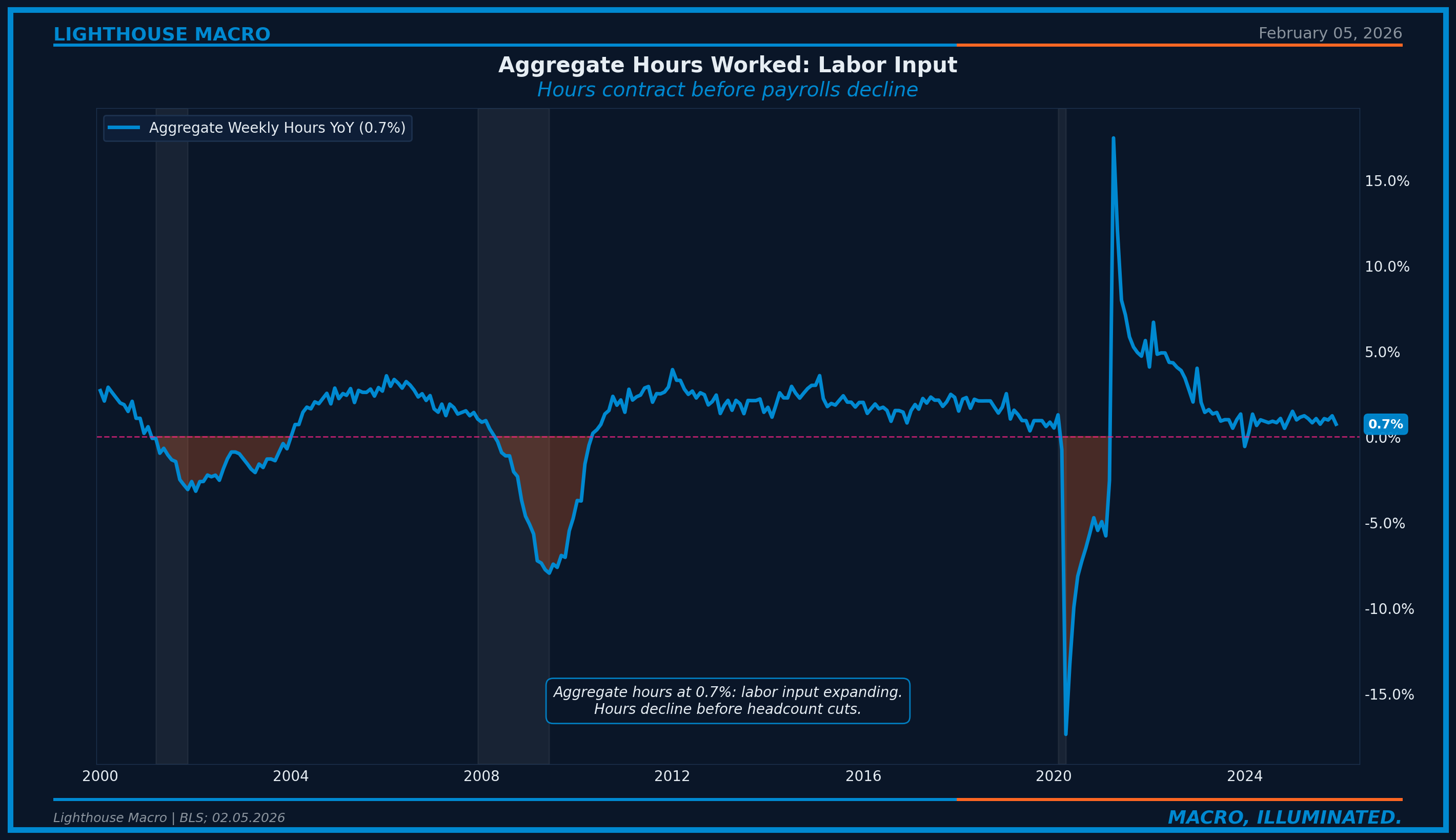 Aggregate Hours Worked YoY. Labor input to output. Released with employment situation (~first Friday). Contraction below 0% signals labor input shrinking.