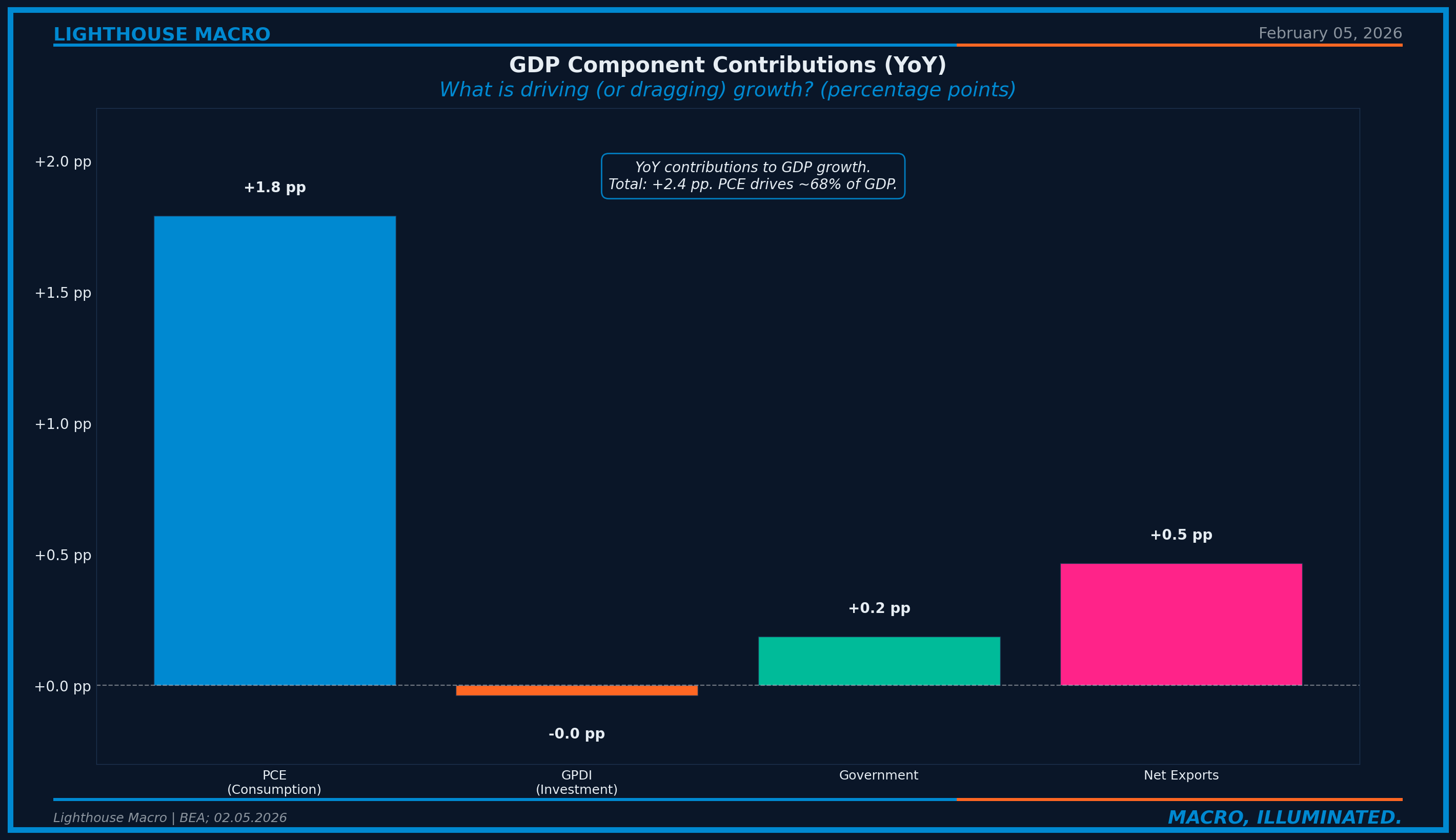 Figure 9: GDP Component Contributions (YoY). PCE (+1.8 pp) drives growth. Net exports (+0.5 pp) added modestly.