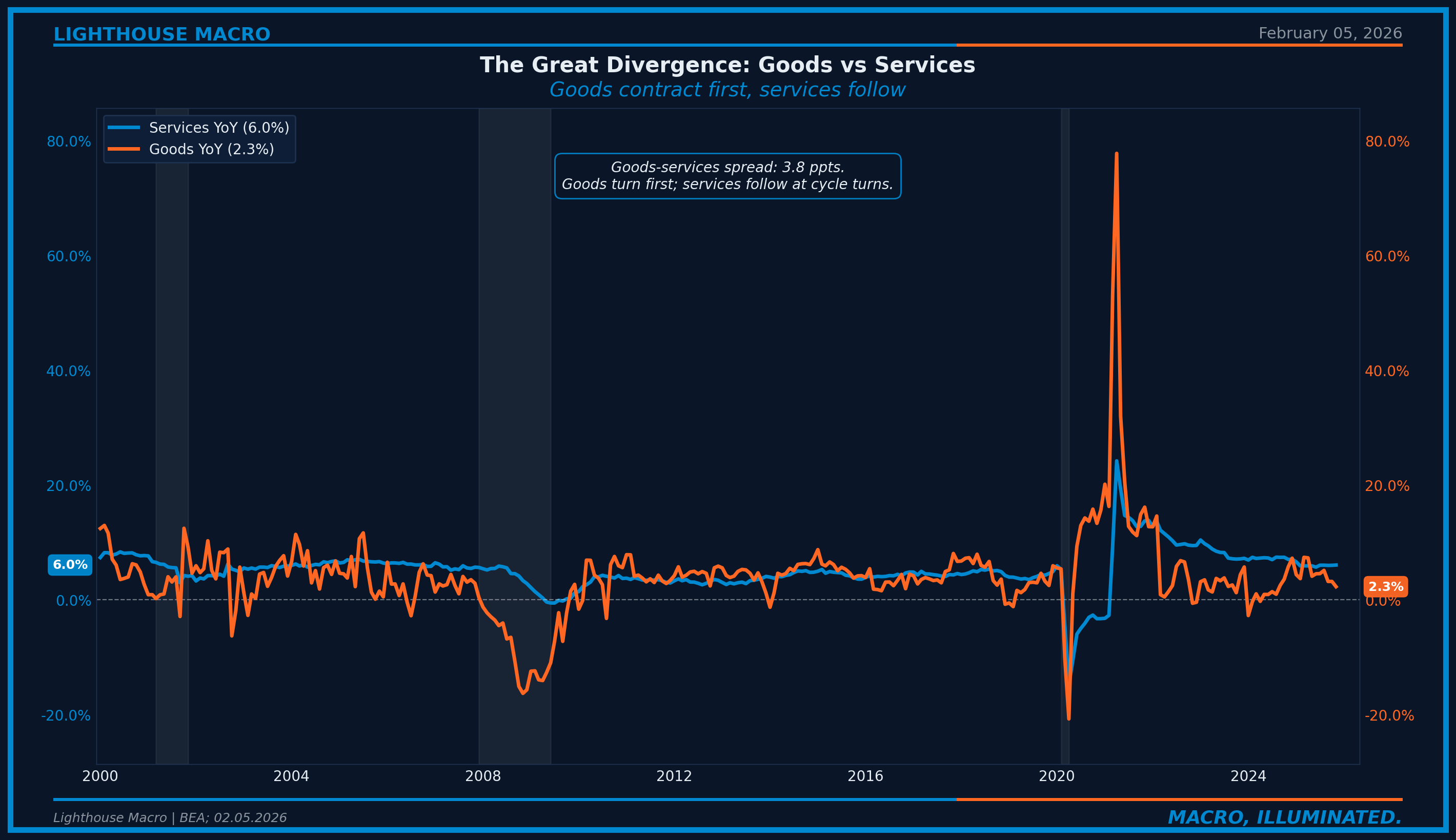 Figure 7: Goods vs Services Consumption YoY. Goods turn first at cycle turns; services follow.