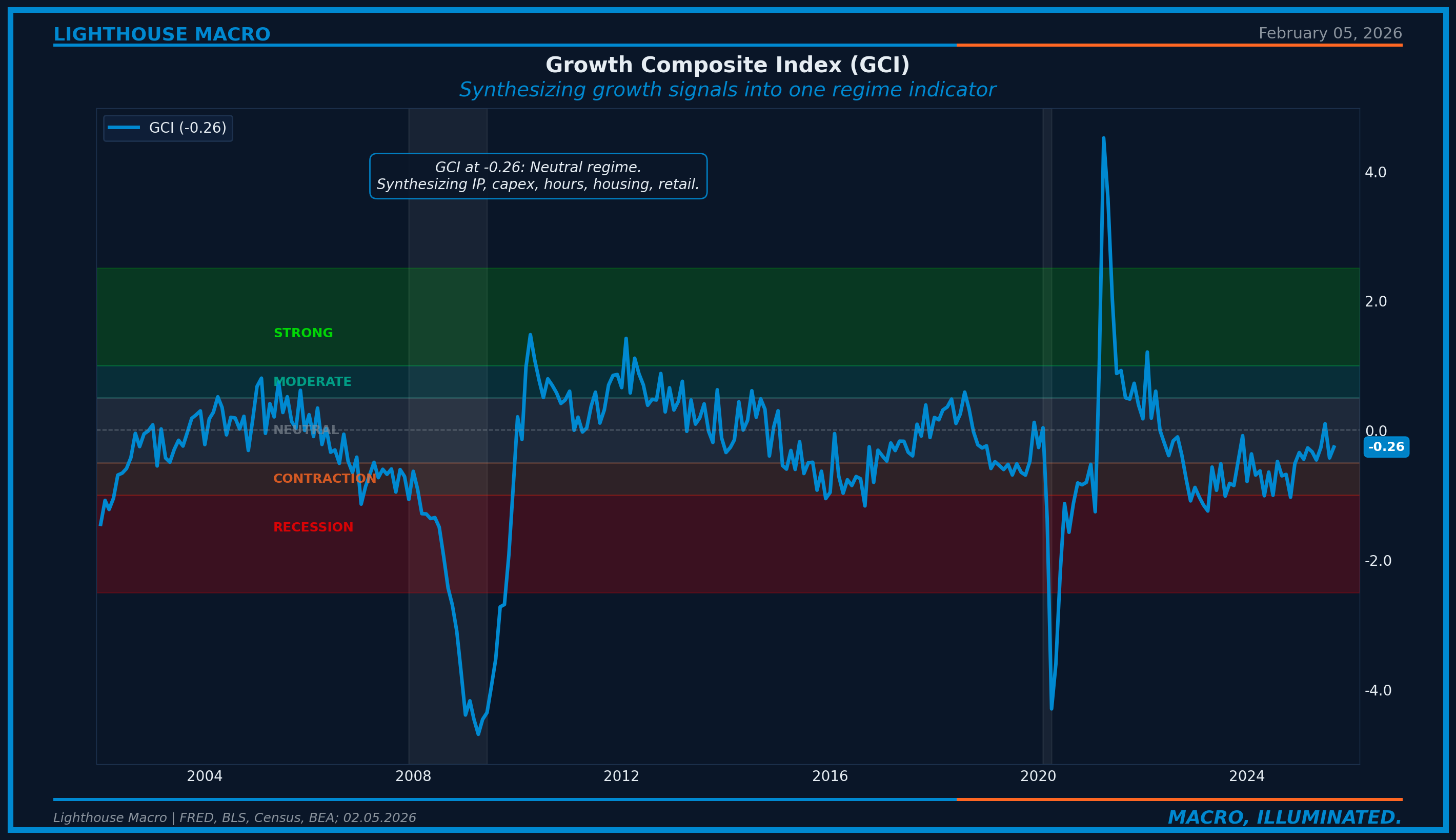 Figure 10: The Growth Composite Index (GCI) with regime bands. Synthesizes IP, capex orders, hours, housing, and retail into one indicator.