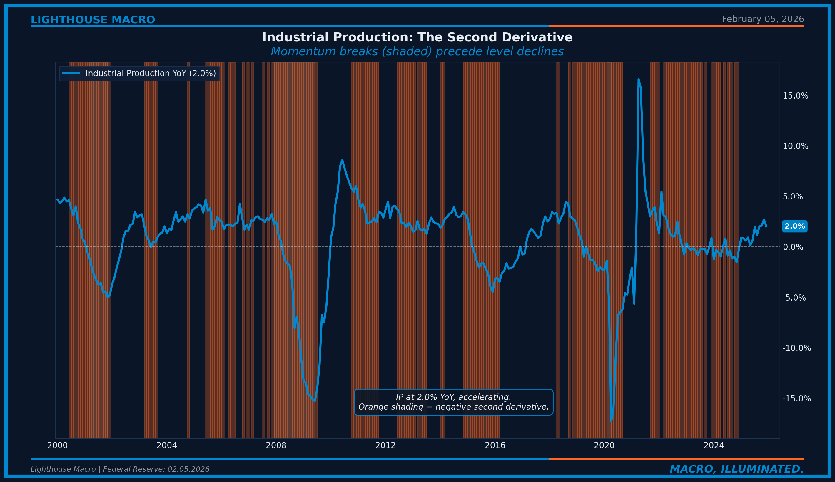 Figure 1: Industrial Production YoY with second derivative shading. Orange bands show periods when momentum is breaking (growth still positive but decelerating).