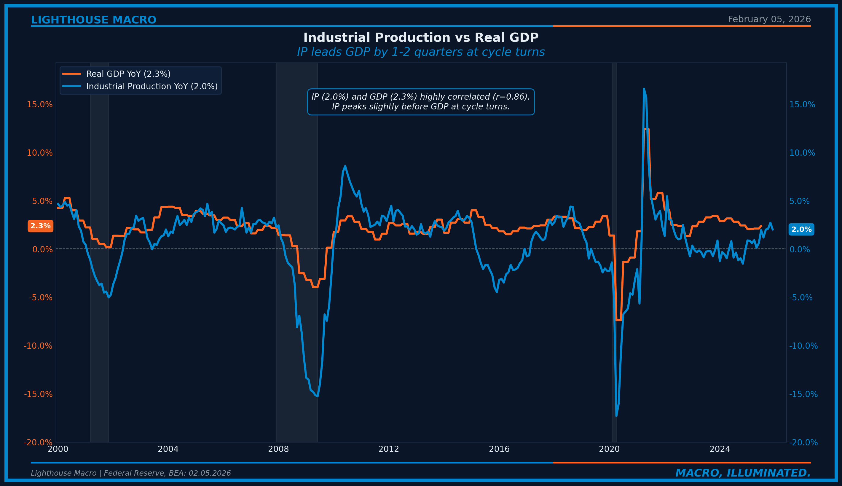 Figure 2: Industrial Production YoY vs Real GDP YoY. Highly correlated, with IP typically peaking slightly before GDP at cycle turns.