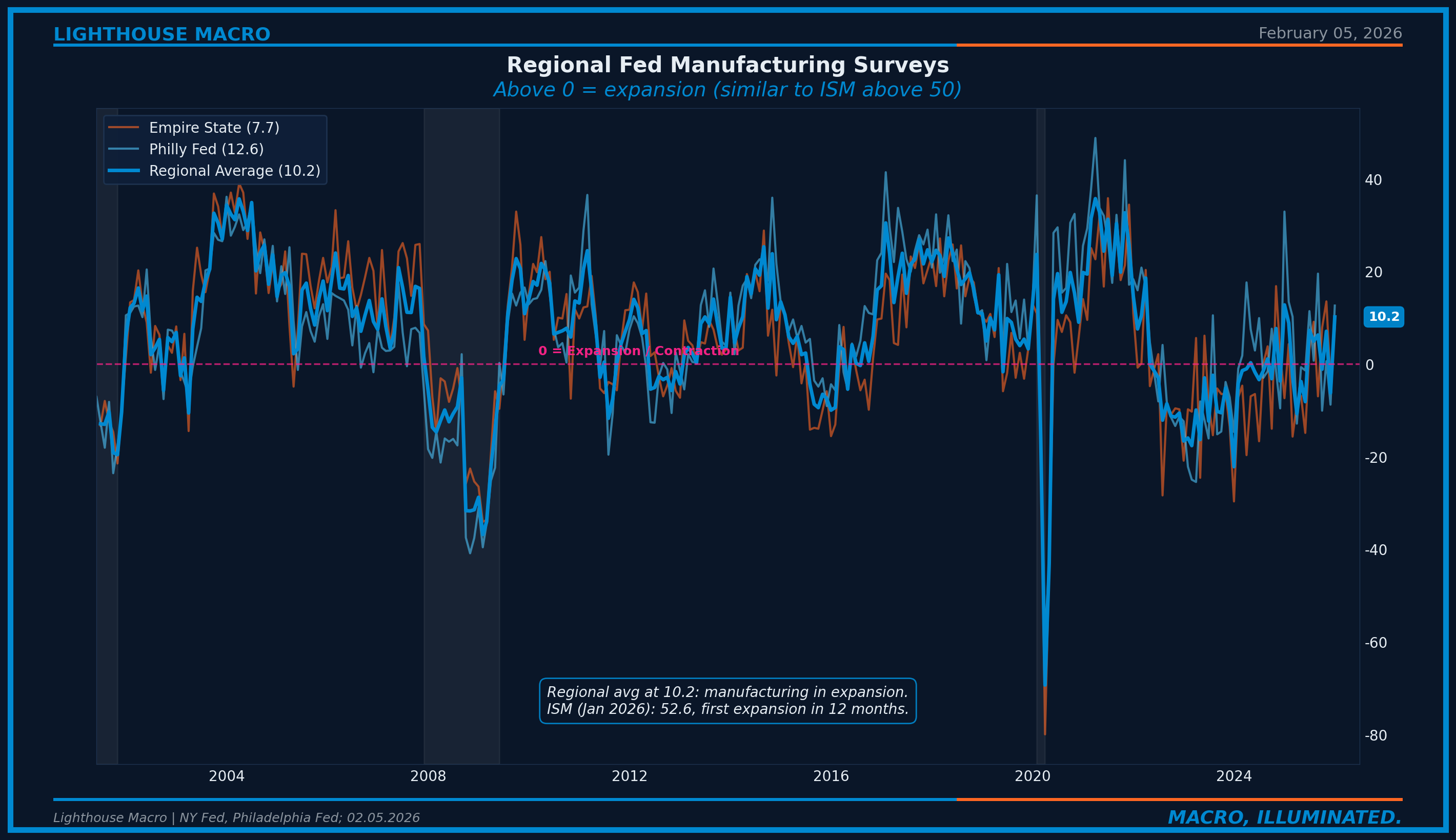 Figure 3: Regional Fed Manufacturing Surveys (Empire State, Philly Fed) serve as a proxy for ISM. Above 0 = expansion, similar to ISM above 50. ISM itself (box) is 52.6 as of January 2026.