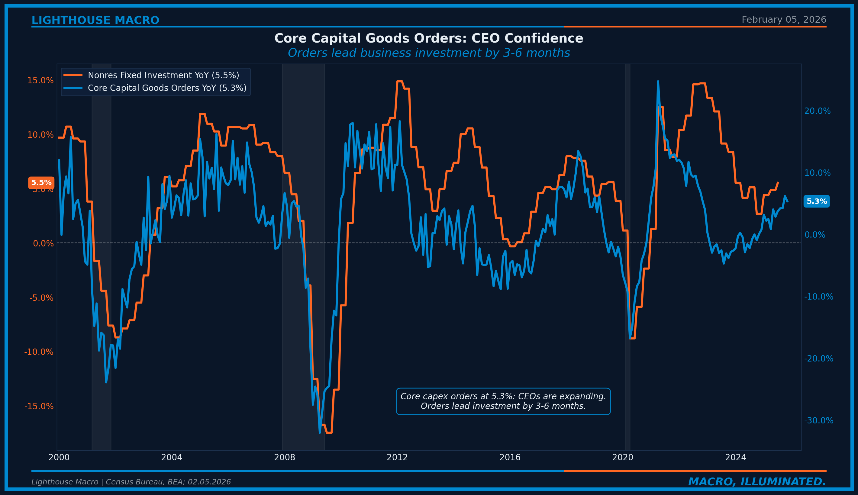 Figure 4: Core Capital Goods Orders YoY vs Nonresidential Fixed Investment. Orders lead investment by 3-6 months.