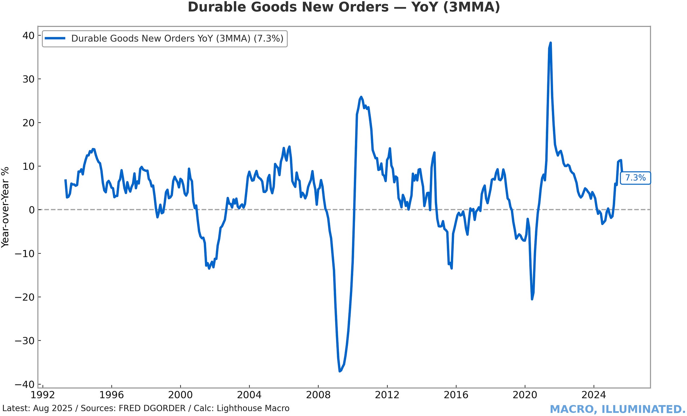 Chart 7: Durable Goods New Orders — YoY (3-Month Moving Average) Durable goods orders have normalized to pre-pandemic growth rates, signaling the demand overshoot that drove goods inflation has fully unwound.