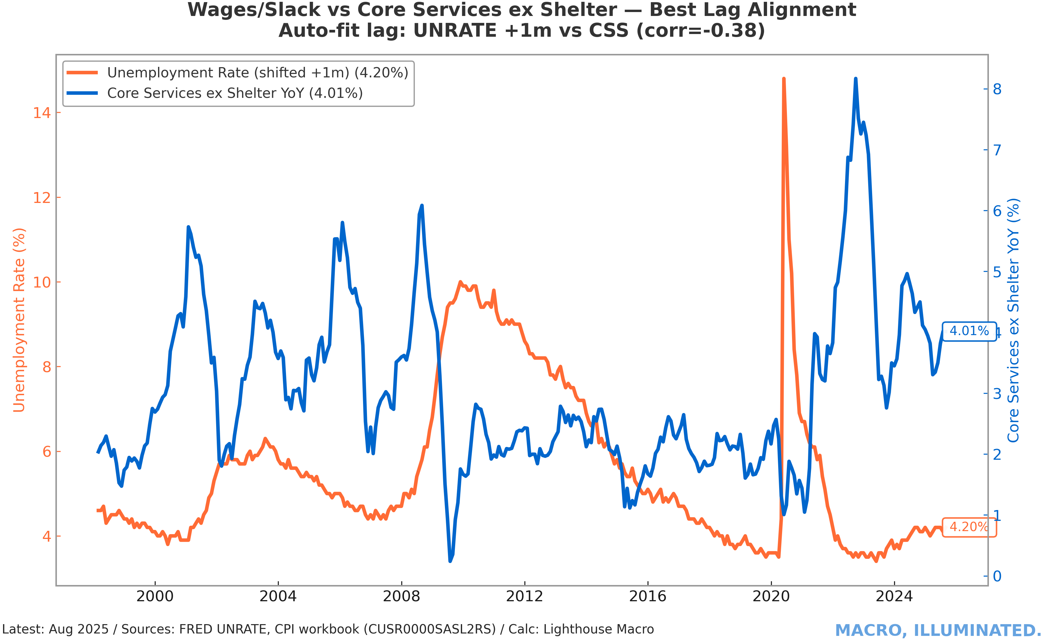 Chart 12: Unemployment Rate vs. Core Services ex Shelter — Best Lag Alignment Unemployment leads services inflation by one month with a -0.38 correlation, suggesting current labor market conditions (4.2% unemployment) are consistent with 4% services inflation — not the 2% target.