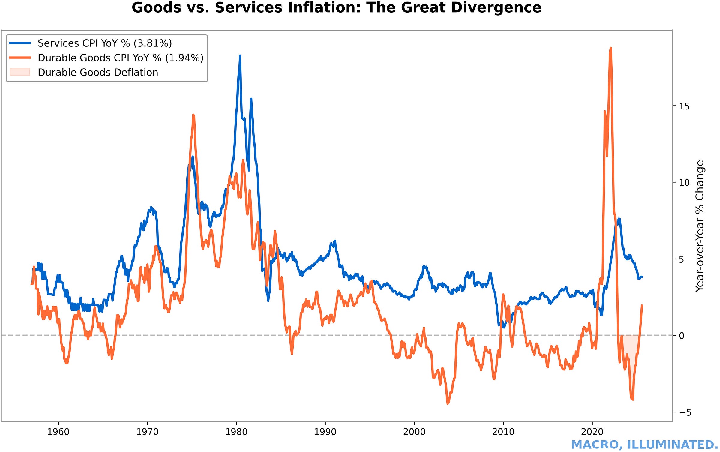 Chart 6: Goods vs. Services Inflation — The Great Divergence Durable goods inflation has reversed into deflation while services remain anchored near 4% YoY, isolating labor-intensive services as the binding constraint on returning to the 2% target.