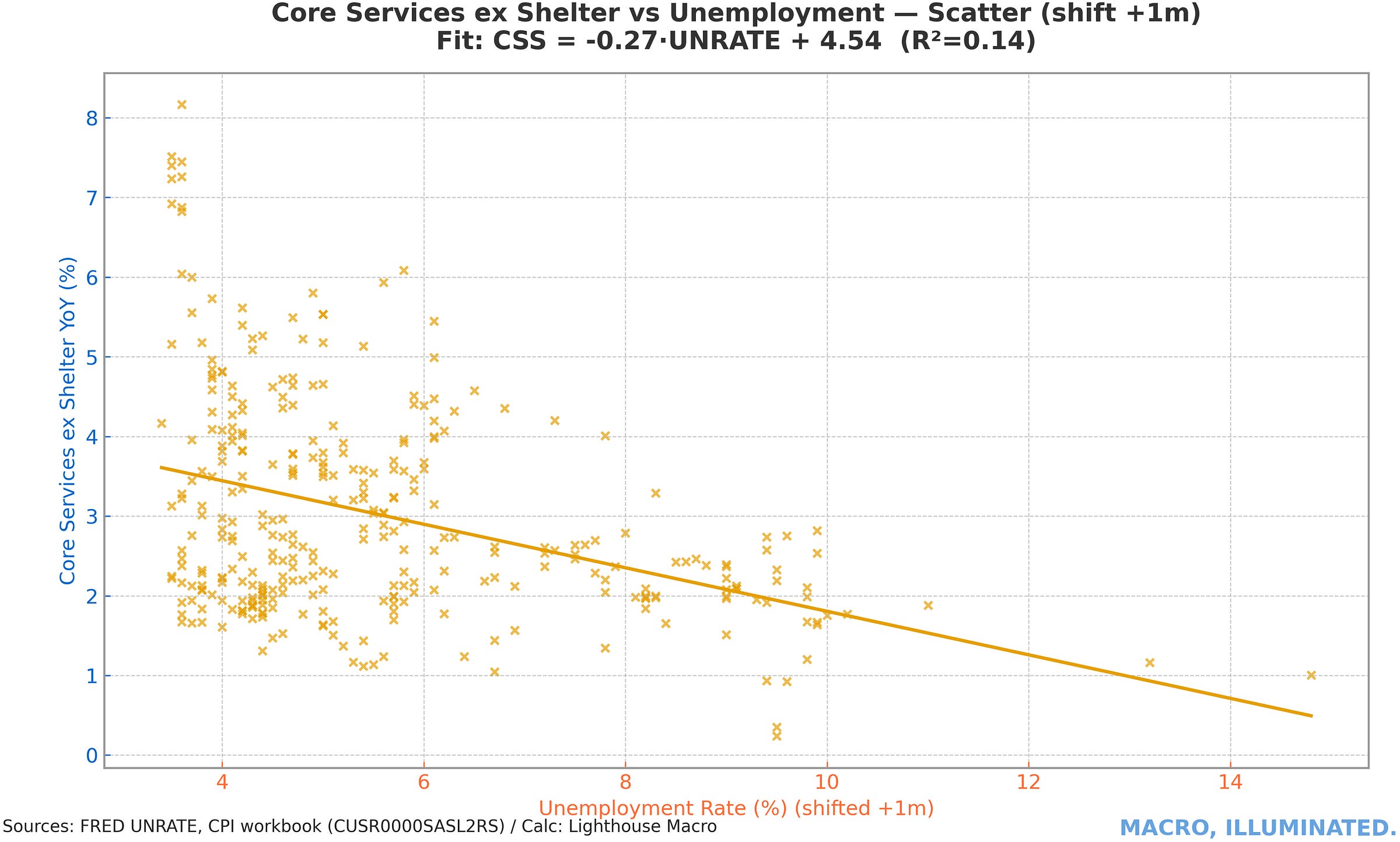 The scatter plot reveals the inverse relationship: services inflation peaks when unemployment troughs, and vice versa. Current unemployment near 4.2% is consistent with services inflation near 4% — not the 2% pace required for overall inflation to return to target.