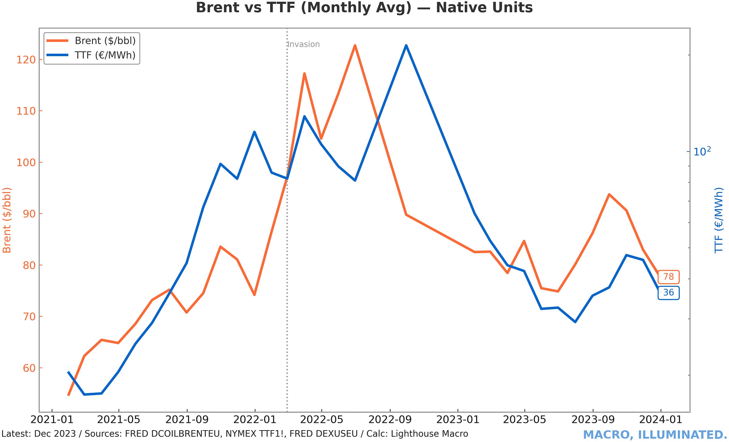 Chart 5: Brent Oil vs. European Natural Gas (TTF) — Native Units Russia’s invasion triggered an asymmetric energy shock with European natural gas spiking to €360/MWh (10x normal) while oil peaked near $130/barrel, extending the inflationary cycle through 2022.