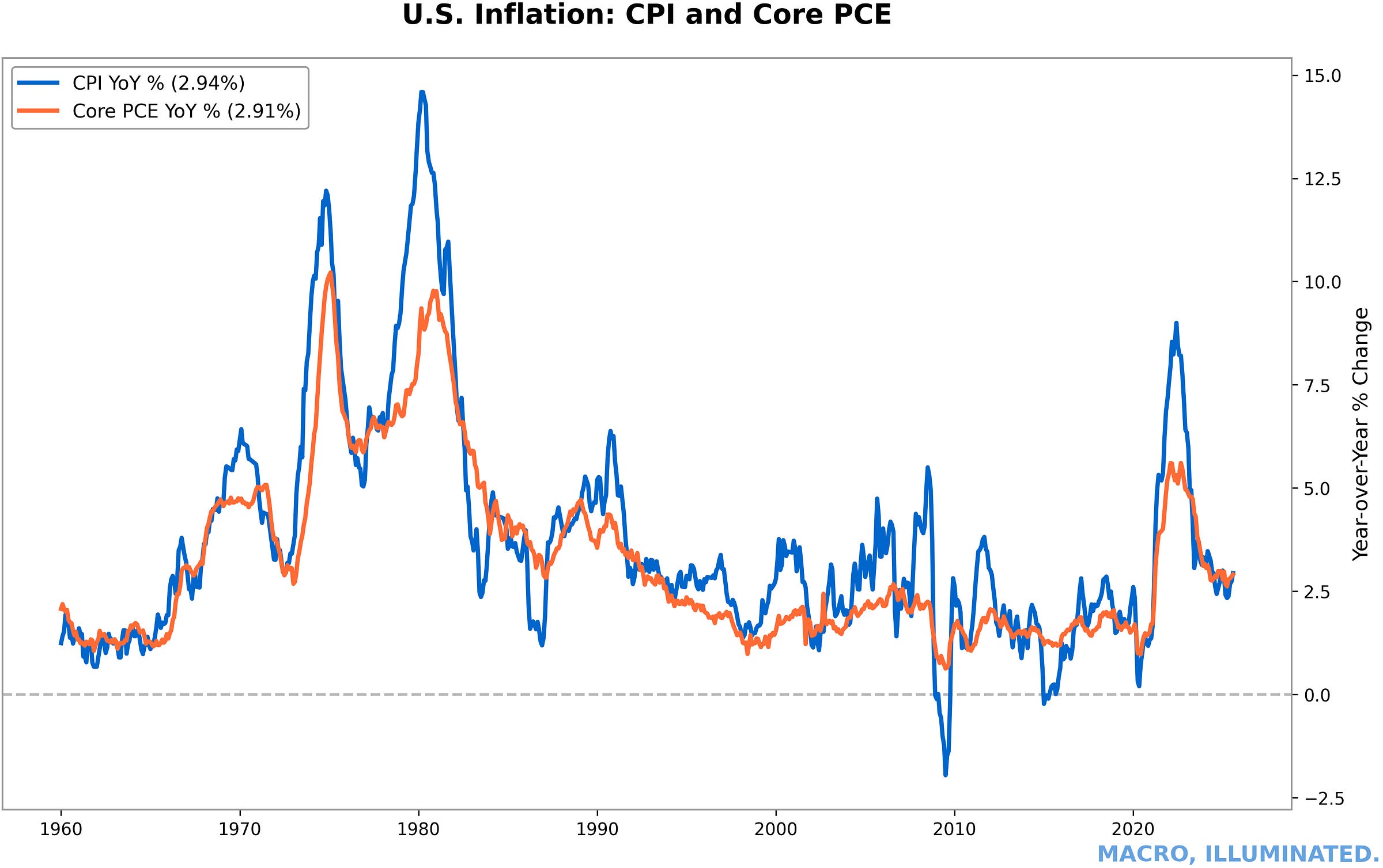 Chart 1: U.S. Inflation — CPI and Core PCE (Full History) The 2021-2022 inflation surge represents the most significant departure from the 2% target since the Volcker era, raising the critical question of whether inflation settles at 2% or stabilizes near 3%.