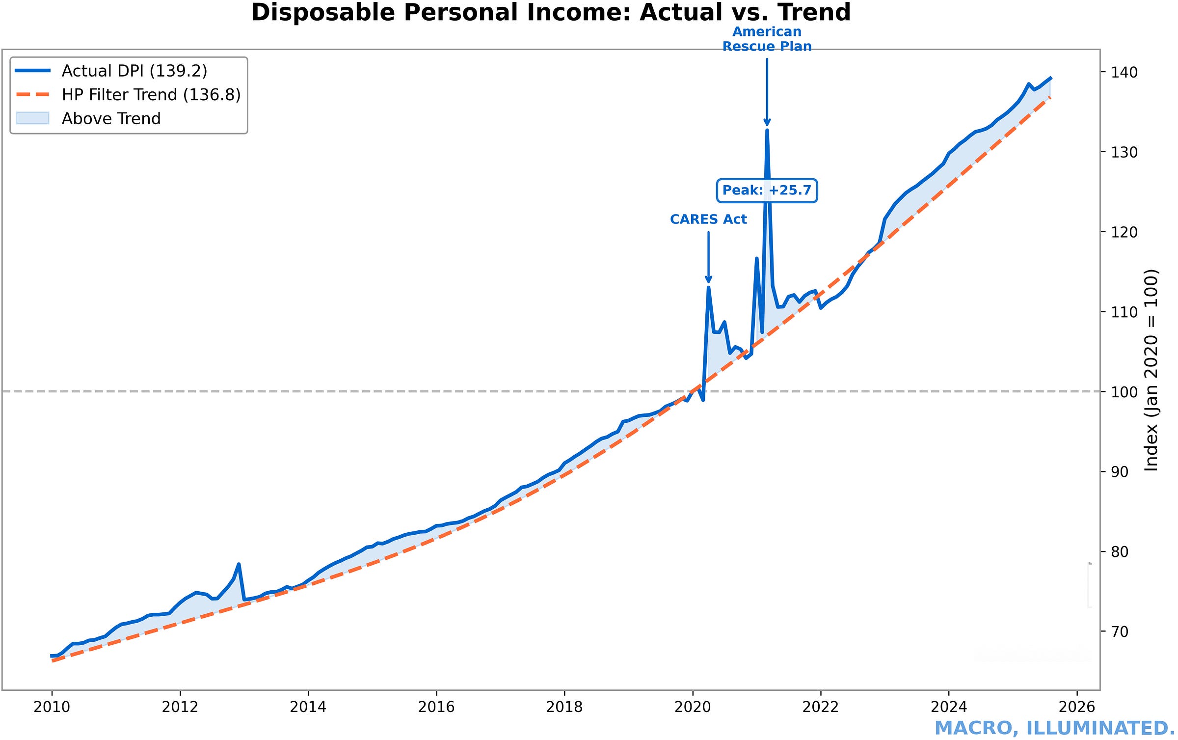 Chart 2: Disposable Personal Income — HP Trend (2010-present) Disposable income surged 15-20% above trend during peak fiscal support — the inverse of a typical recession — creating unprecedented demand-side inflationary pressure.