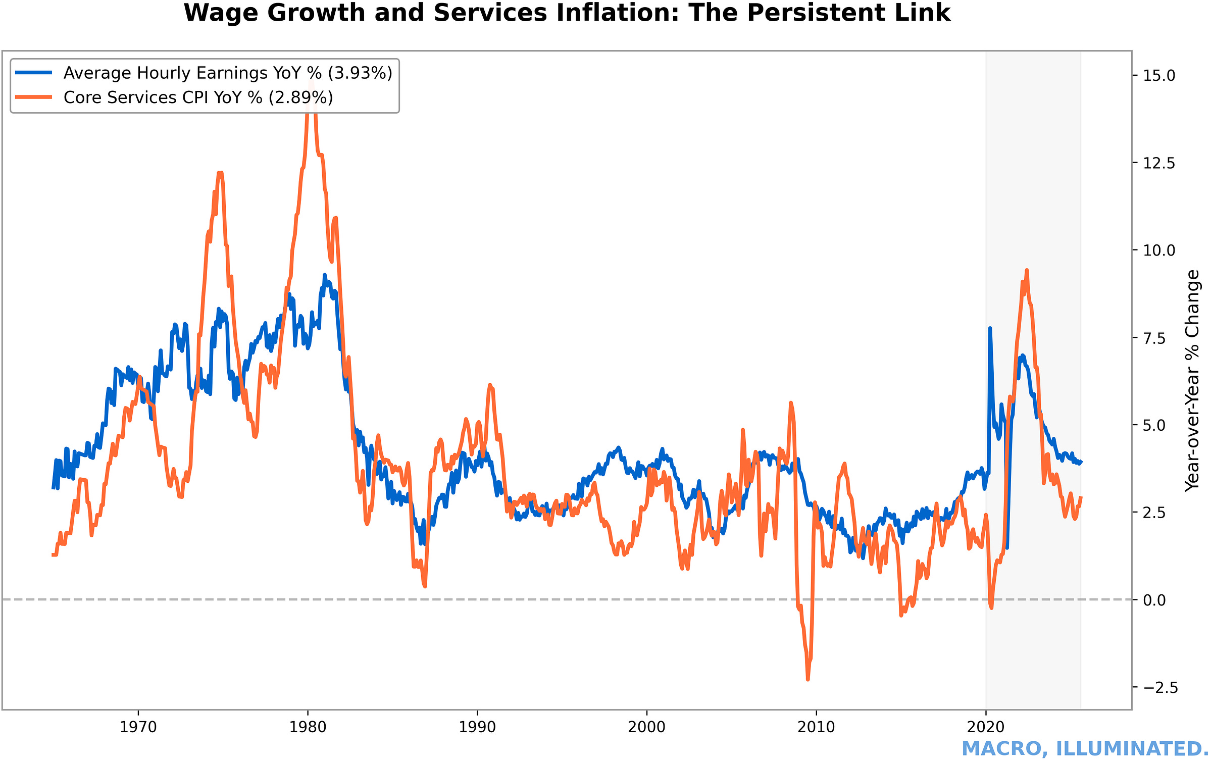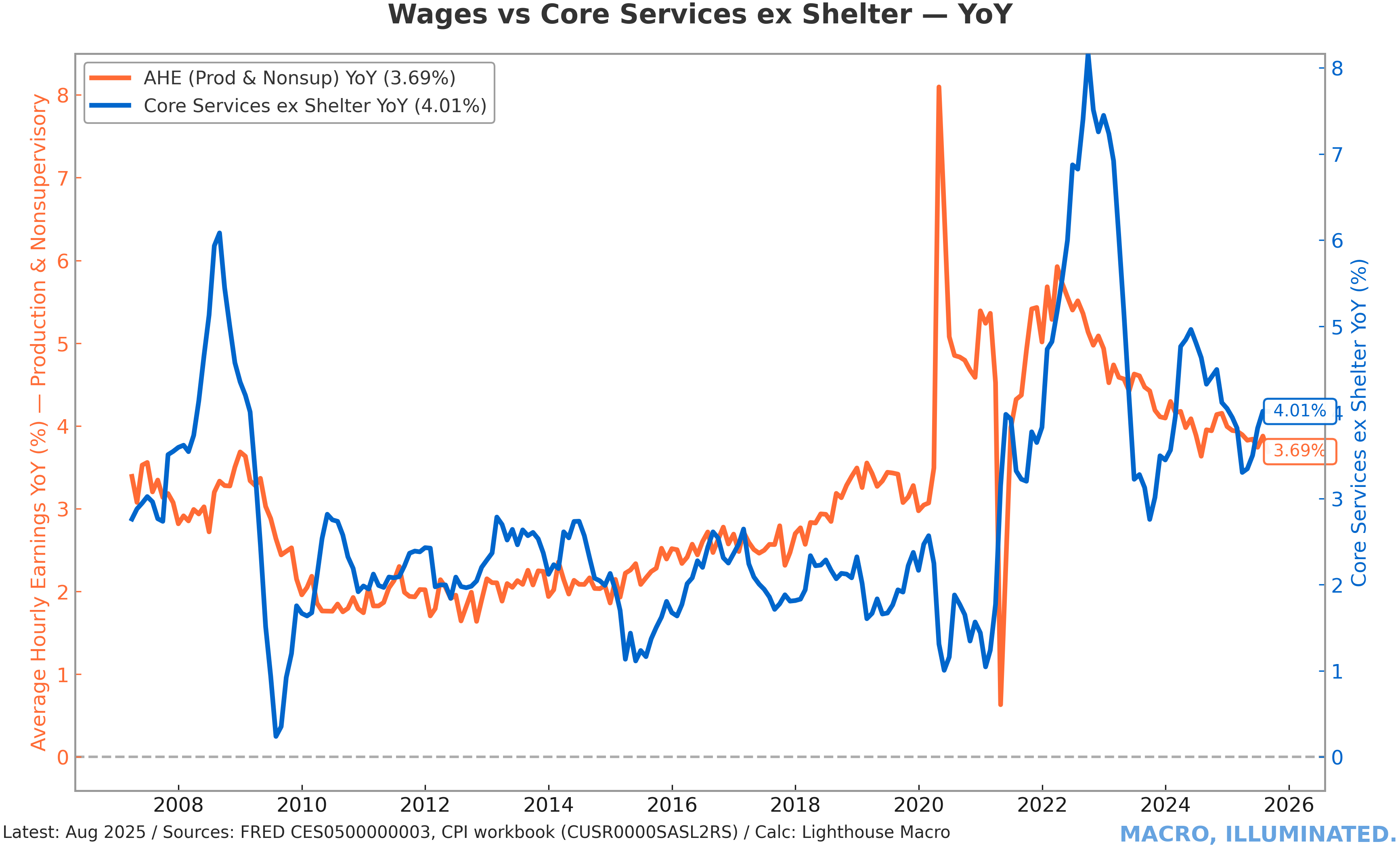 Chart 9: Wages vs. Core Services ex Shelter — YoY Average hourly earnings at 4% YoY drive services inflation near 4%, revealing the tight contemporaneous link between labor costs and the persistent component of inflation.