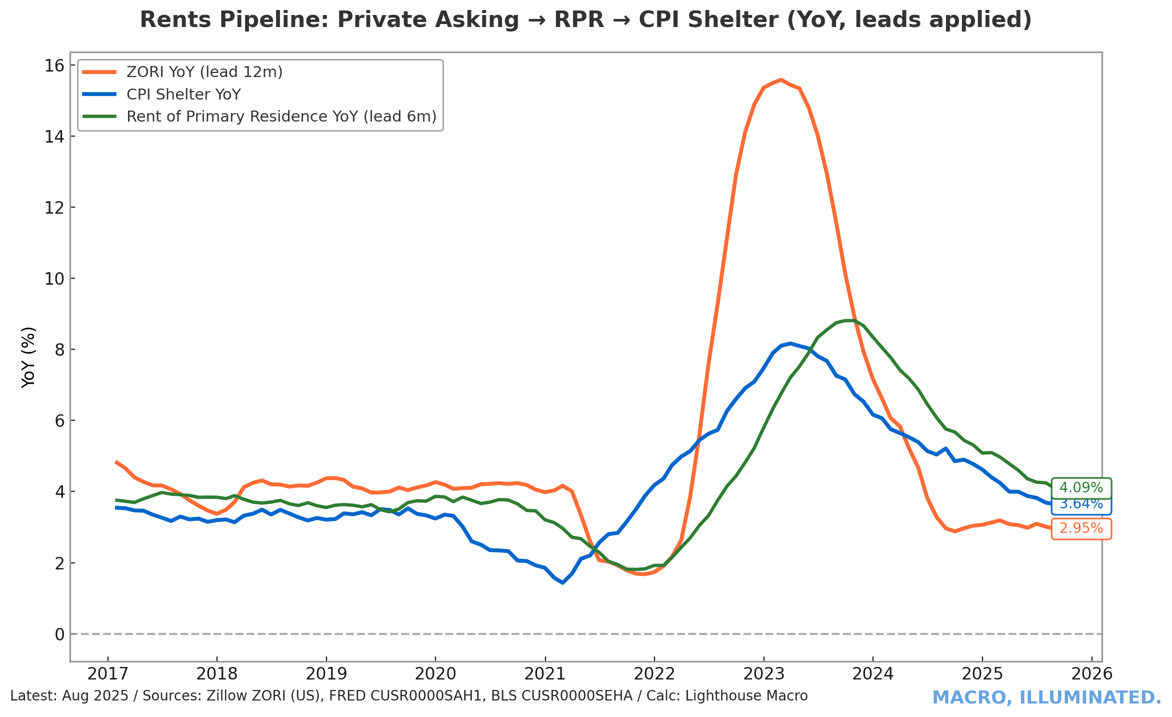 Shelter inflation — which accounts for roughly one-third of headline CPI — remains the single largest contributor to inflation persistence. But shelter inflation is misleading due to severe measurement lags.Private market data from Zillow (asking rents) and the BLS’s Rent of Primary Residence (RPR) survey show that new lease rents have cooled significantly — Zillow’s observed rent index has decelerated from 16% YoY to under 3% YoY.