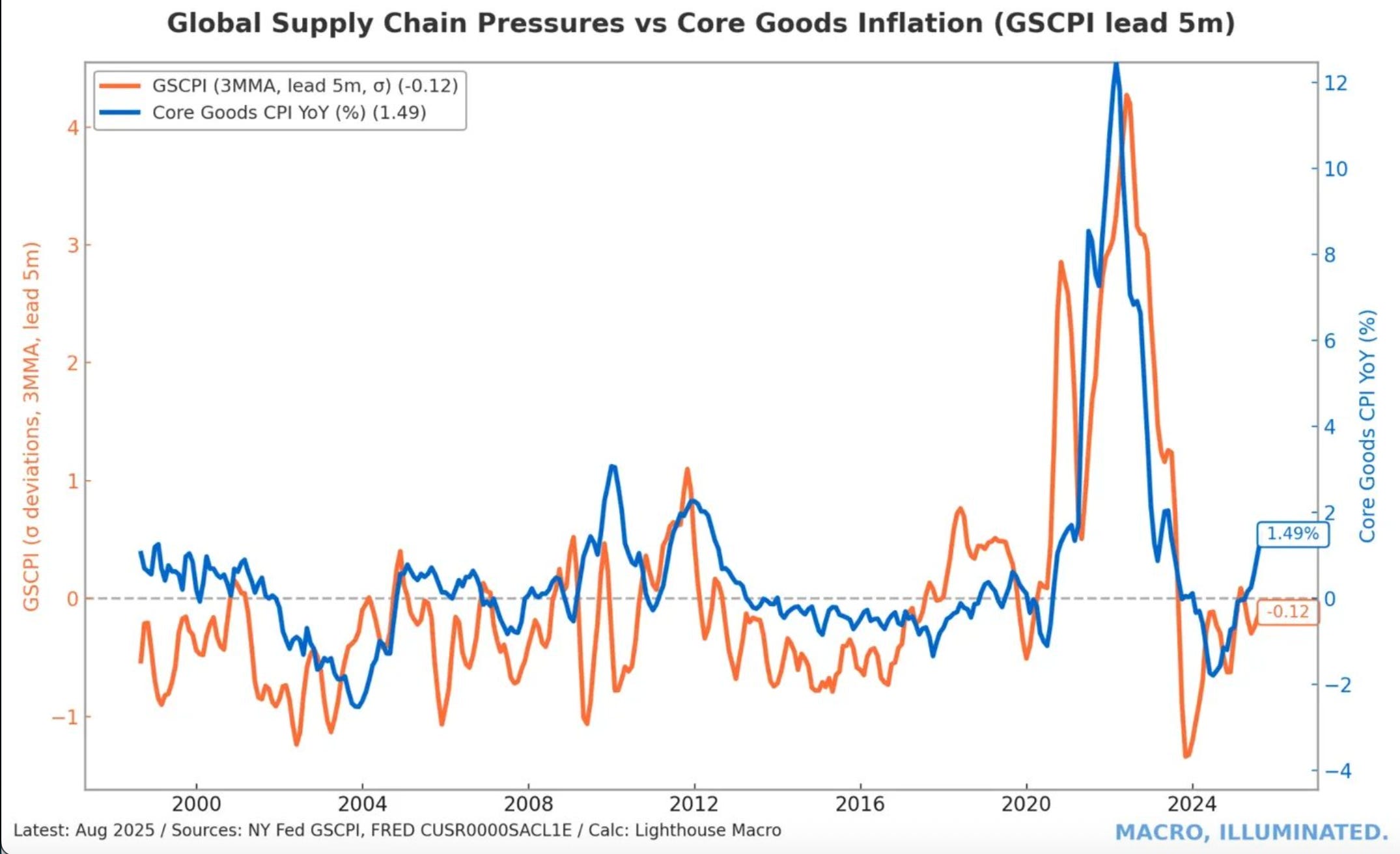 Chart 4: Global Supply Chain Pressures vs. Core Goods Inflation Supply chain pressures normalized by mid-2022 while inflation persisted, confirming demand — not supply disruptions — drove the sustained inflation surge.