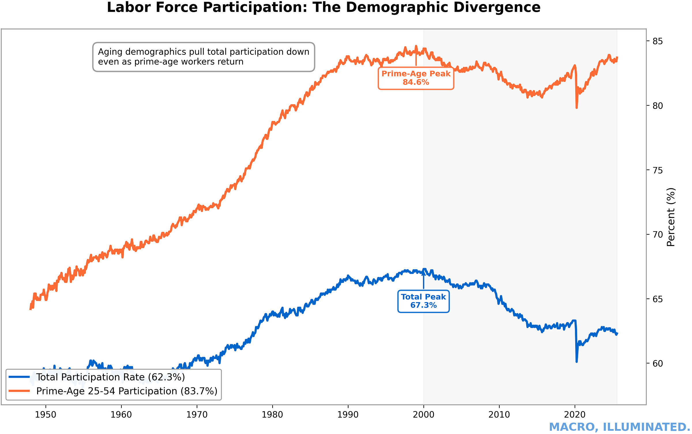 The gap reflects aging demographics. Baby Boomers are retiring en masse, shrinking the labor force even as prime-age workers return. The structural decline in total participation reduces potential labor supply, keeping labor markets tighter than historical unemployment rates would suggest.