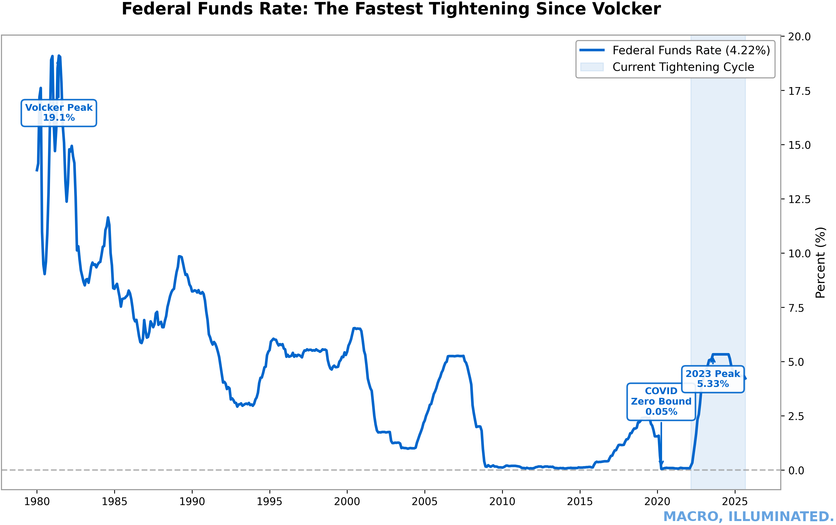 Chart 14: Federal Funds Rate — The Fastest Tightening Since Volcker The 525 basis point hike in 16 months represents the most aggressive tightening since the early 1980s, with lag effects still filtering through the economy and historical precedent suggesting soft landings are rare.