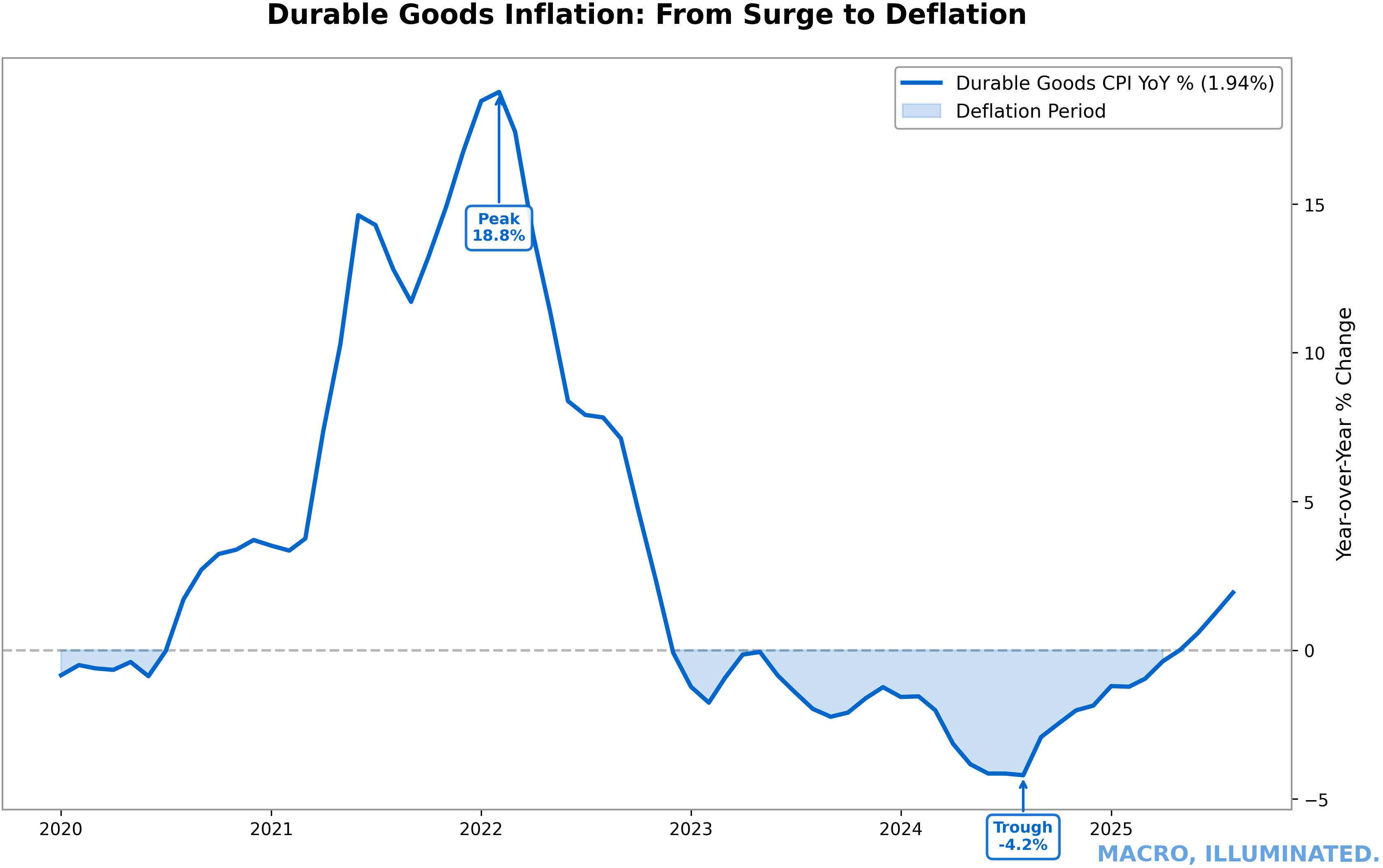 Chart 8: Durable Goods Inflation — From Surge to Deflation The 23 percentage point swing from +18.8% to -4.2% represents the most dramatic goods price reversal since 1950, effectively solving the goods component of inflation.