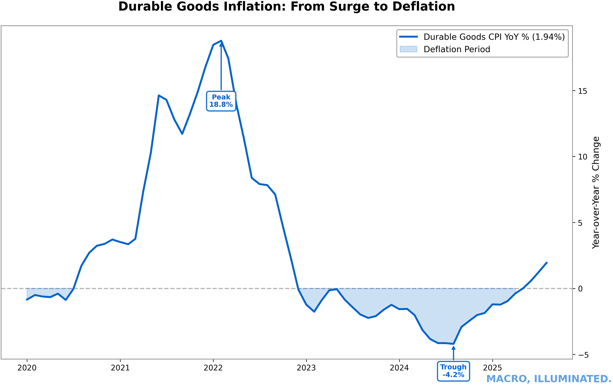 Durable goods inflation surged to 18% year-over-year in early 2022 — driven by used cars, appliances, electronics, and furniture — then collapsed into outright deflation by 2024. Durable goods prices are now falling year-over-year, subtracting from headline CPI.